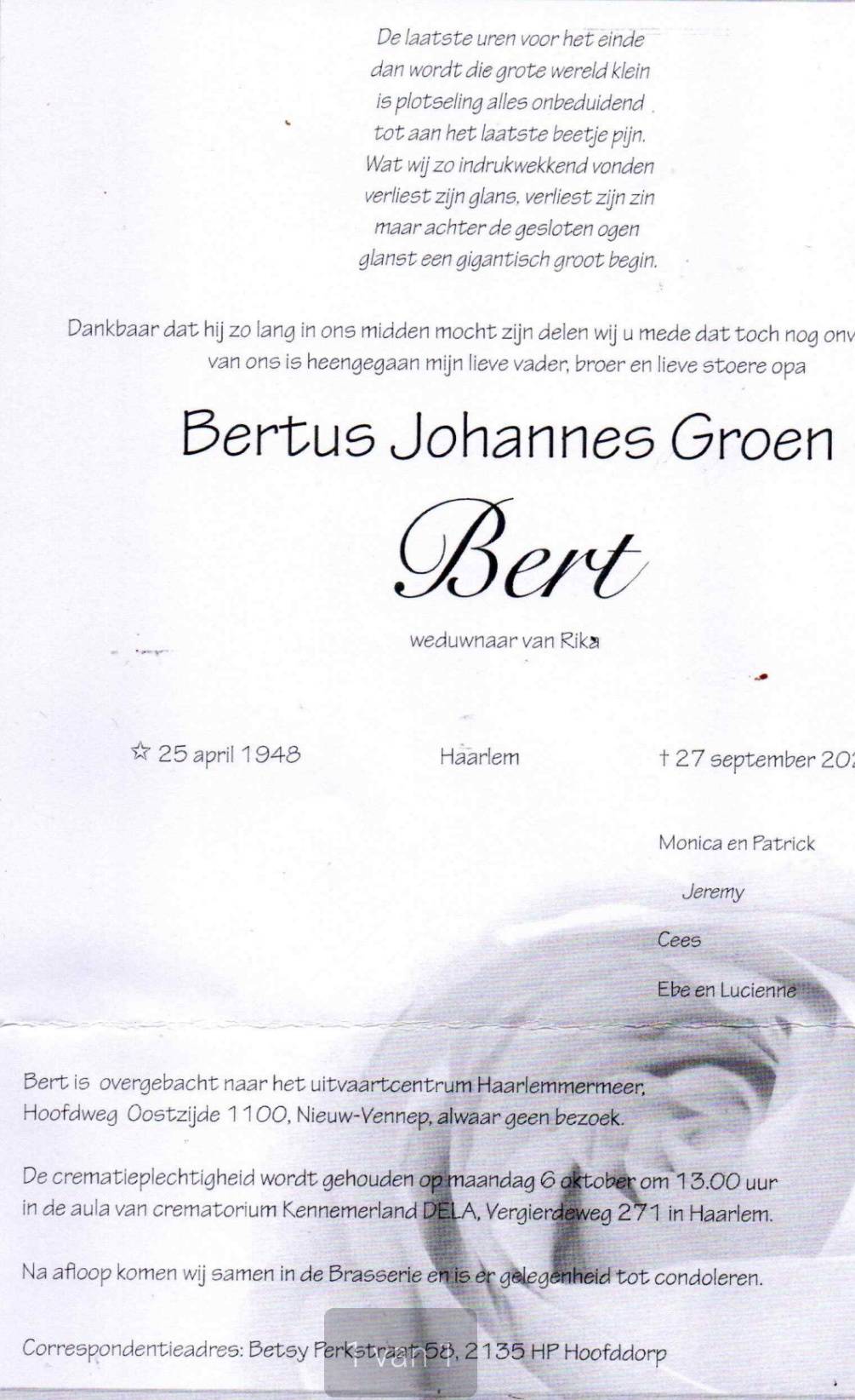 Van het overlijden van onze vriend en Lid en oud voorzitter van de BVH